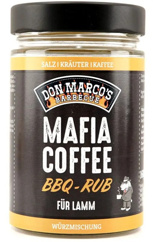 Der Don Marcos Mafia Coffee BBQ Rub ist eine mediterrane Gewürzmischung mit Kräutern und löslichem Bohnenkaffee, die ausgezeichnet zu rotem Fleisch wie Lamm, Rind und Schwein passt. Keine Allergene